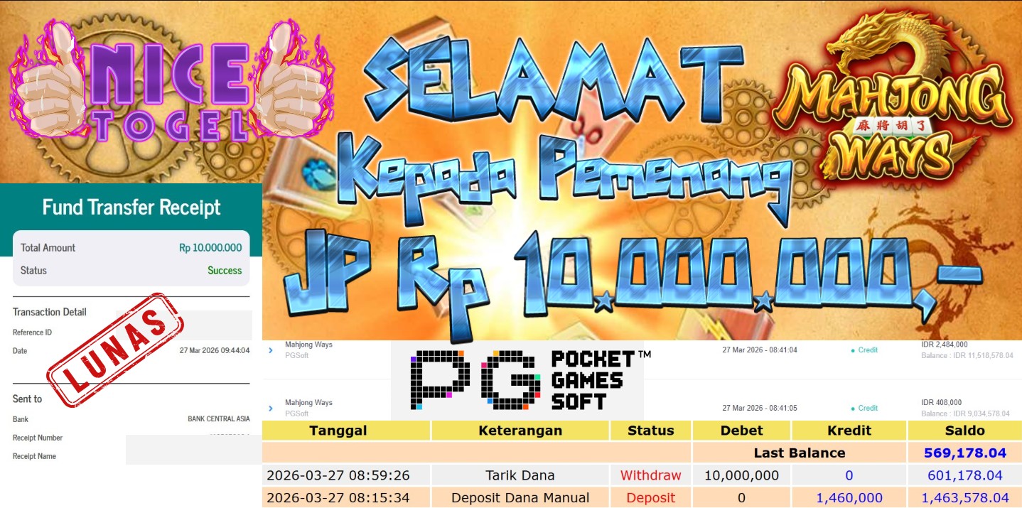 Selamat kepada User id : VBDFGD**** Telah berhasil mendapatkan kemenangan besar pada permainan SLOT MAHJONG WAYS Dengan kemenangan Sebesar Rp. 10.000.000,- Setelah mengisi formulir withdraw dengan kurung waktu hanya 5 – 10 menit pihak NICETOGEL sudah melakukan transfer kepada pemilik Userid dan dana sudah dapat di cairkan oleh pemenang. Bukti pembayaran yang kami berikan merupakan bukti pembayaran yang SAH / VALID yang langung di dapatkan melaui tanda transfer transaksi dari Bank yang di tuju.