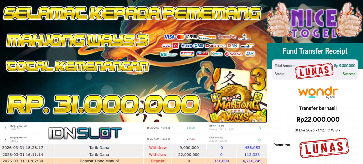 Selamat kepada User id : MUD**** Telah berhasil mendapatkan kemenangan besar pada permainan SLOT MAHJONG WAYS 3   Dengan kemenangan Sebesar Rp. 31.000.000,- Setelah mengisi formulir withdraw dengan kurung waktu hanya 5 – 10 menit pihak NICETOGEL sudah melakukan transfer kepada pemilik Userid dan dana sudah dapat di cairkan oleh pemenang. Bukti pembayaran yang kami berikan merupakan bukti pembayaran yang SAH / VALID yang langung di dapatkan melaui tanda transfer transaksi dari Bank yang di tuju.