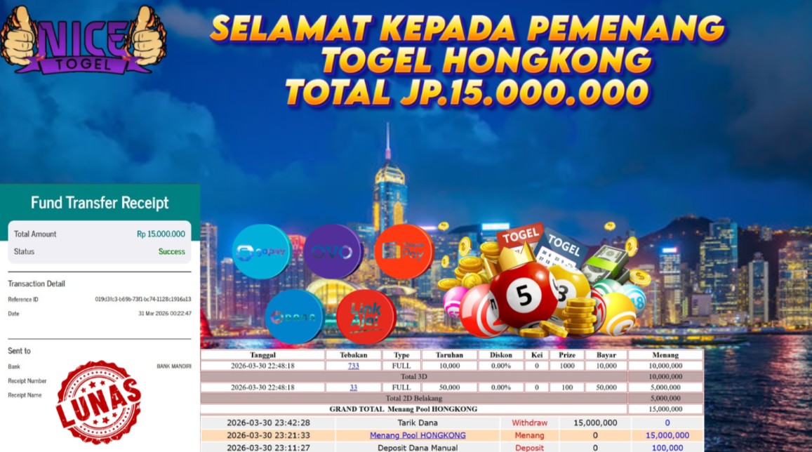 Selamat kepada User id : VSF**** Telah berhasil mendapatkan kemenangan besar pada permainan TOGEL HONGKONG Dengan kemenangan Sebesar Rp. 15.000.000,- Setelah mengisi formulir withdraw dengan kurung waktu hanya 5 – 10 menit pihak NICETOGEL sudah melakukan transfer kepada pemilik Userid dan dana sudah dapat di cairkan oleh pemenang. Bukti pembayaran yang kami berikan merupakan bukti pembayaran yang SAH / VALID yang langung di dapatkan melaui tanda transfer transaksi dari Bank yang di tuju.