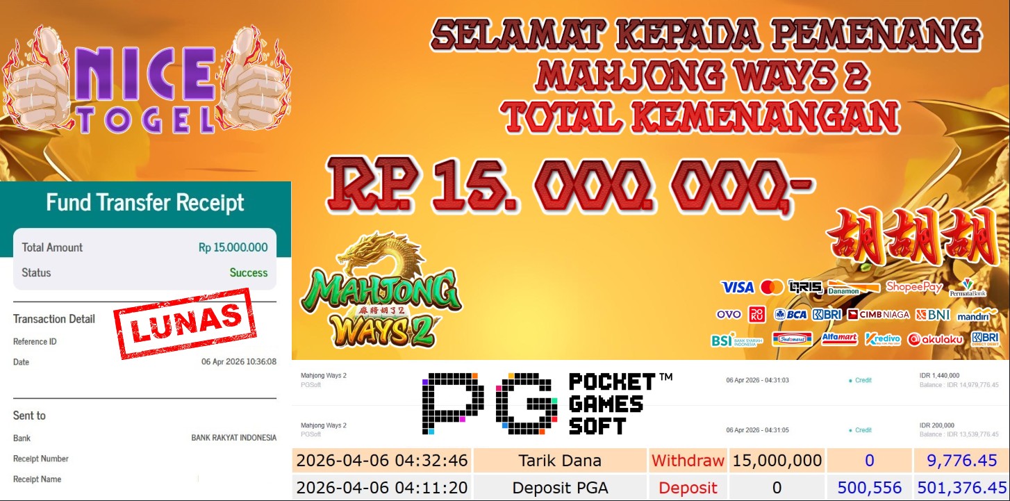 Selamat kepada User id : GLNG**** Telah berhasil mendapatkan kemenangan besar pada permainan SLOT MAHJONG WAYS 2 Dengan kemenangan Sebesar Rp. 15.000.000,- Setelah mengisi formulir withdraw dengan kurung waktu hanya 5 – 10 menit pihak NICETOGEL sudah melakukan transfer kepada pemilik Userid dan dana sudah dapat di cairkan oleh pemenang. Bukti pembayaran yang kami berikan merupakan bukti pembayaran yang SAH / VALID yang langung di dapatkan melaui tanda transfer transaksi dari Bank yang di tuju.