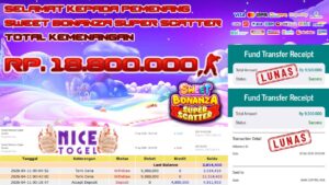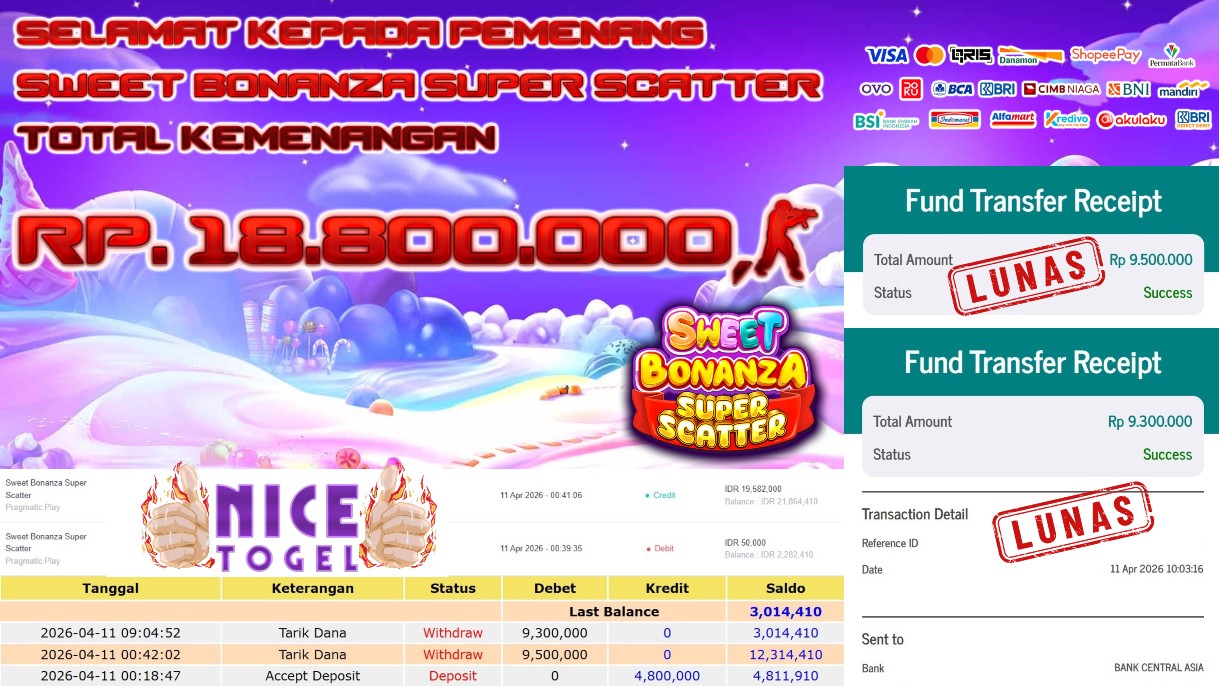 Selamat kepada User id : DFE**** Telah berhasil mendapatkan kemenangan besar pada permainan SLOT SWEET BONANZA SUPER SCATTER Dengan kemenangan Sebesar Rp. 18.800.000,- Setelah mengisi formulir withdraw dengan kurung waktu hanya 5 – 10 menit pihak NICETOGEL sudah melakukan transfer kepada pemilik Userid dan dana sudah dapat di cairkan oleh pemenang. Bukti pembayaran yang kami berikan merupakan bukti pembayaran yang SAH / VALID yang langung di dapatkan melaui tanda transfer transaksi dari Bank yang di tuju.