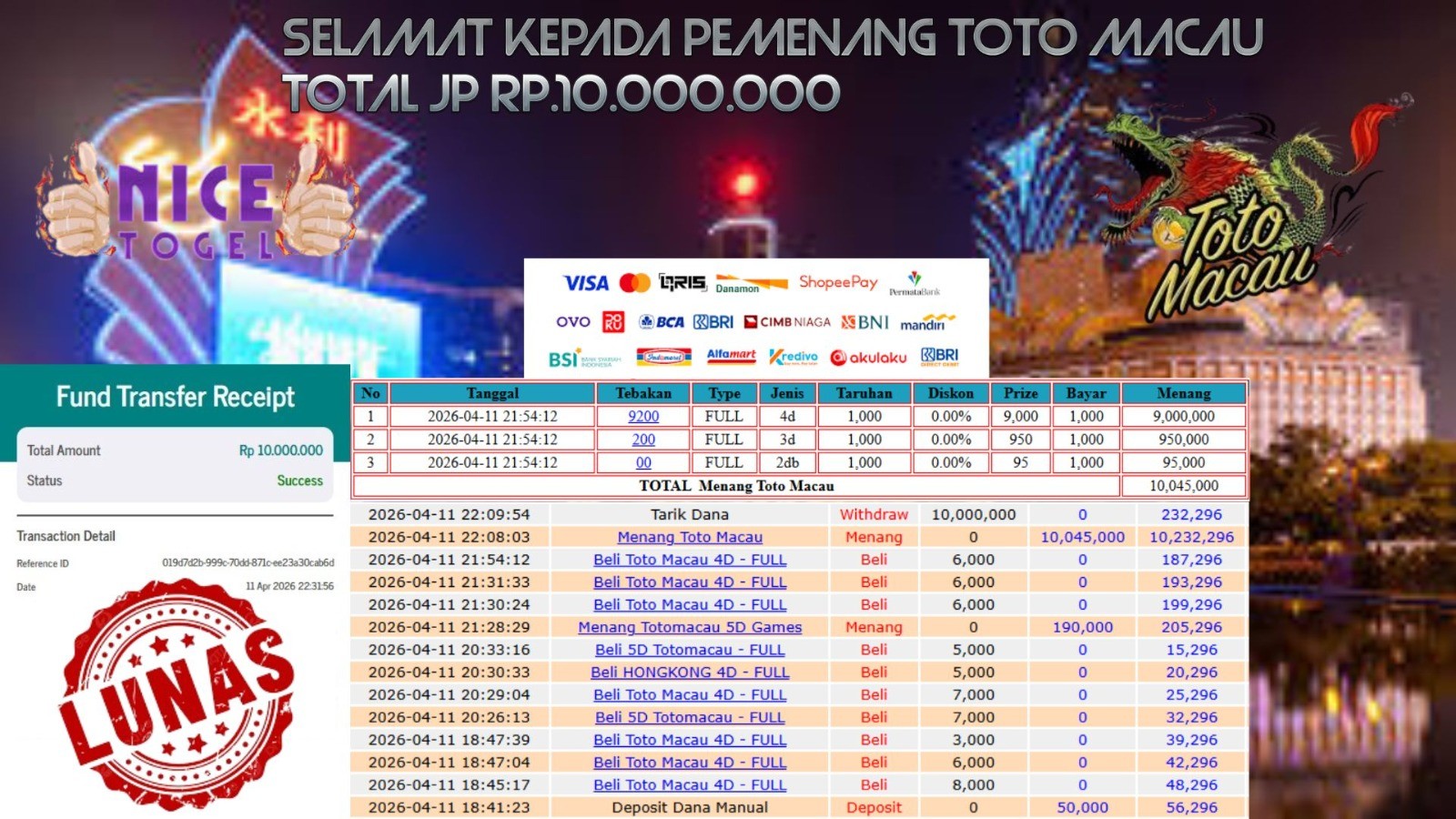 Selamat kepada User id : BGD**** Telah berhasil mendapatkan kemenangan besar pada permainan TOGEL TOTOMACAU Dengan kemenangan Sebesar Rp. 10,000,0000,- Setelah mengisi formulir withdraw dengan kurung waktu hanya 5 – 10 menit pihak NICETOGEL sudah melakukan transfer kepada pemilik Userid dan dana sudah dapat di cairkan oleh pemenang. Bukti pembayaran yang kami berikan merupakan bukti pembayaran yang SAH / VALID yang langung di dapatkan melaui tanda transfer transaksi dari Bank yang di tuju.