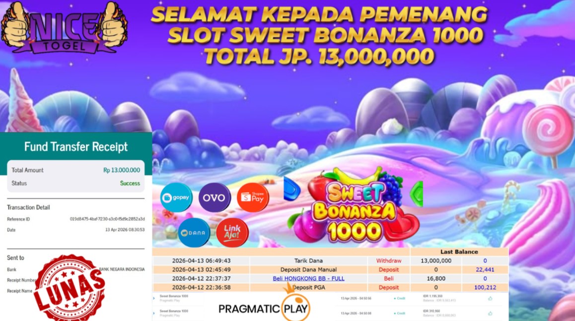 Selamat kepada User id : VFG**** Telah berhasil mendapatkan kemenangan besar pada permainan SLOT SWEET BONANZA 1000   Dengan kemenangan Sebesar Rp. 13.000.000,- Setelah mengisi formulir withdraw dengan kurung waktu hanya 5 – 10 menit pihak NICETOGEL sudah melakukan transfer kepada pemilik Userid dan dana sudah dapat di cairkan oleh pemenang. Bukti pembayaran yang kami berikan merupakan bukti pembayaran yang SAH / VALID yang langung di dapatkan melaui tanda transfer transaksi dari Bank yang di tuju.