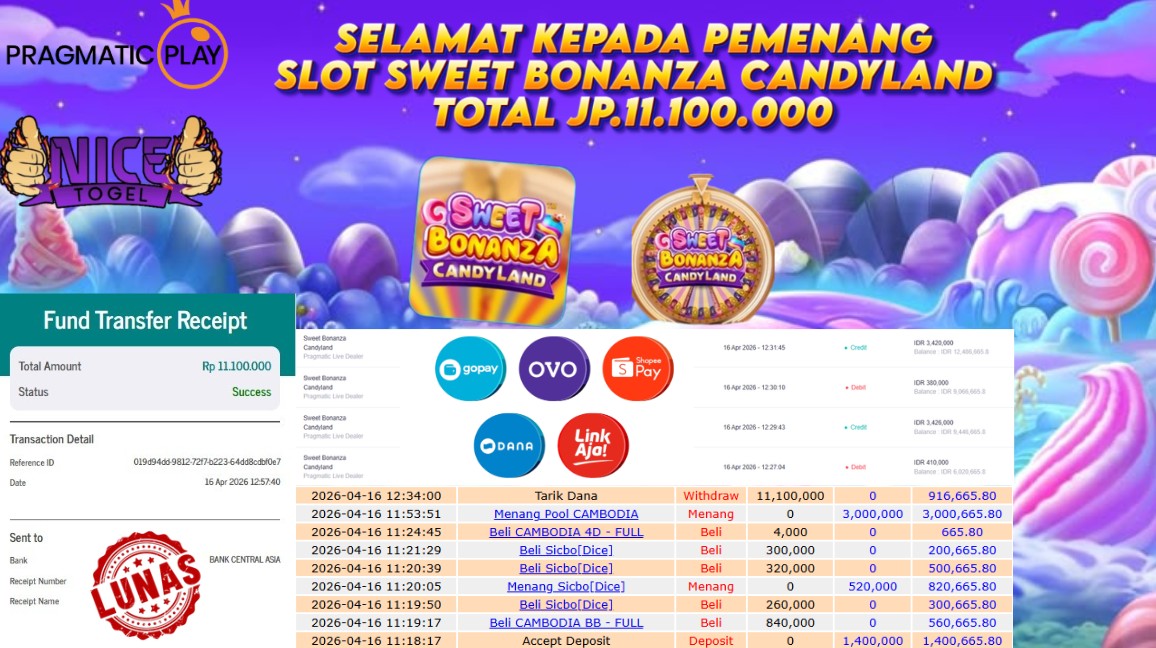 Selamat kepada User id : CDF**** Telah berhasil mendapatkan kemenangan besar pada permainan SLOT SWEET BONANZA CANDYLAND   Dengan kemenangan Sebesar Rp. 11.100.000,- Setelah mengisi formulir withdraw dengan kurung waktu hanya 5 – 10 menit pihak NICETOGEL sudah melakukan transfer kepada pemilik Userid dan dana sudah dapat di cairkan oleh pemenang. Bukti pembayaran yang kami berikan merupakan bukti pembayaran yang SAH / VALID yang langung di dapatkan melaui tanda transfer transaksi dari Bank yang di tuju.