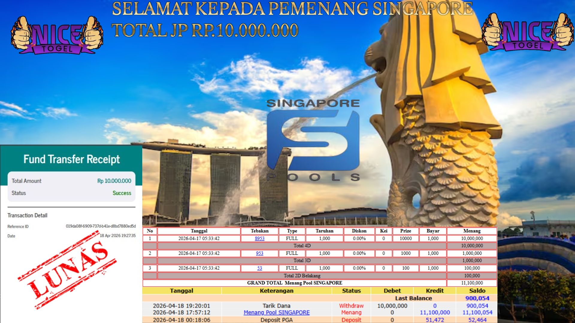 Selamat kepada User id : DVR**** Telah berhasil mendapatkan kemenangan besar pada permainan TOGEL SINGAPORE Dengan kemenangan Sebesar Rp. 10.000.000,- Setelah mengisi formulir withdraw dengan kurung waktu hanya 5 – 10 menit pihak NICETOGEL sudah melakukan transfer kepada pemilik Userid dan dana sudah dapat di cairkan oleh pemenang. Bukti pembayaran yang kami berikan merupakan bukti pembayaran yang SAH / VALID yang langung di dapatkan melaui tanda transfer transaksi dari Bank yang di tuju.
