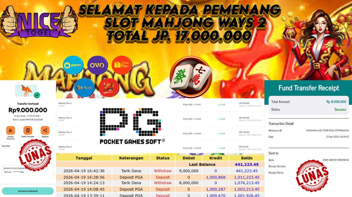 Selamat kepada User id : LALA**** Telah berhasil mendapatkan kemenangan besar pada permainan SLOT MAHJONG WAYS 2   Dengan kemenangan Sebesar Rp. 17.000.000,- Setelah mengisi formulir withdraw dengan kurung waktu hanya 5 – 10 menit pihak NICETOGEL sudah melakukan transfer kepada pemilik Userid dan dana sudah dapat di cairkan oleh pemenang. Bukti pembayaran yang kami berikan merupakan bukti pembayaran yang SAH / VALID yang langung di dapatkan melaui tanda transfer transaksi dari Bank yang di tuju.