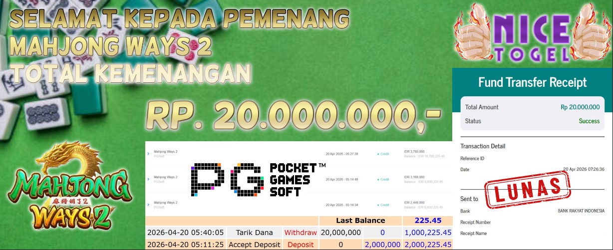 Selamat kepada User id : HORN**** Telah berhasil mendapatkan kemenangan besar pada permainan SLOT MAHJONG WAYS 2   Dengan kemenangan Sebesar Rp. 20.000.000,- Setelah mengisi formulir withdraw dengan kurung waktu hanya 5 – 10 menit pihak NICETOGEL sudah melakukan transfer kepada pemilik Userid dan dana sudah dapat di cairkan oleh pemenang. Bukti pembayaran yang kami berikan merupakan bukti pembayaran yang SAH / VALID yang langung di dapatkan melaui tanda transfer transaksi dari Bank yang di tuju.