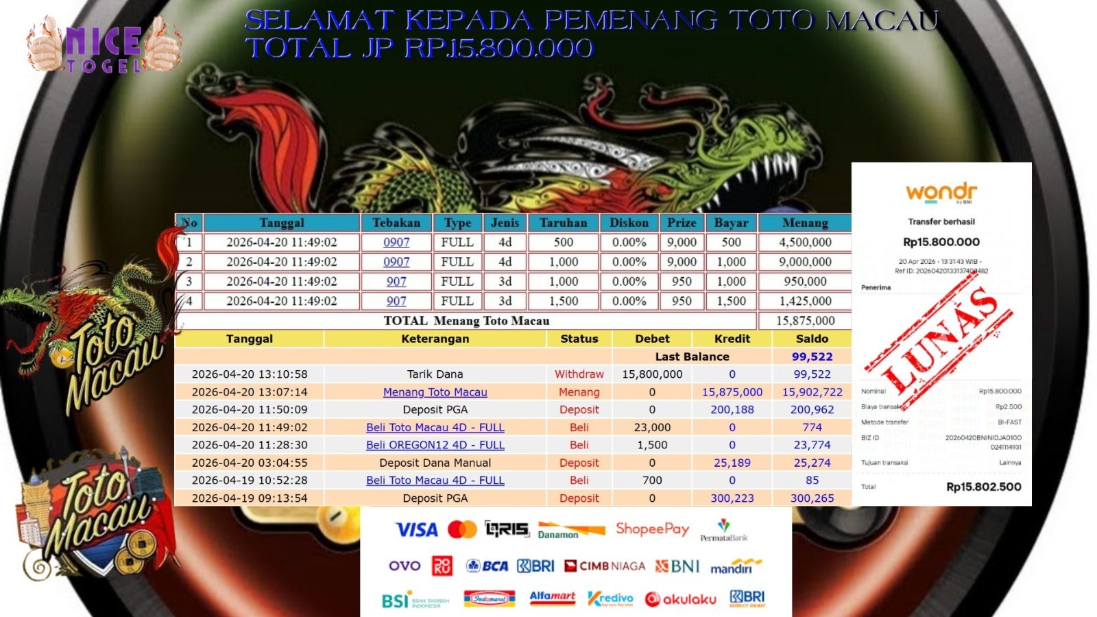 Selamat kepada User id : NJD**** Telah berhasil mendapatkan kemenangan besar pada permainan TOGEL TOTOMACAU Dengan kemenangan Sebesar Rp. 15.800.000,- Setelah mengisi formulir withdraw dengan kurung waktu hanya 5 – 10 menit pihak NICETOGEL sudah melakukan transfer kepada pemilik Userid dan dana sudah dapat di cairkan oleh pemenang. Bukti pembayaran yang kami berikan merupakan bukti pembayaran yang SAH / VALID yang langung di dapatkan melaui tanda transfer transaksi dari Bank yang di tuju.