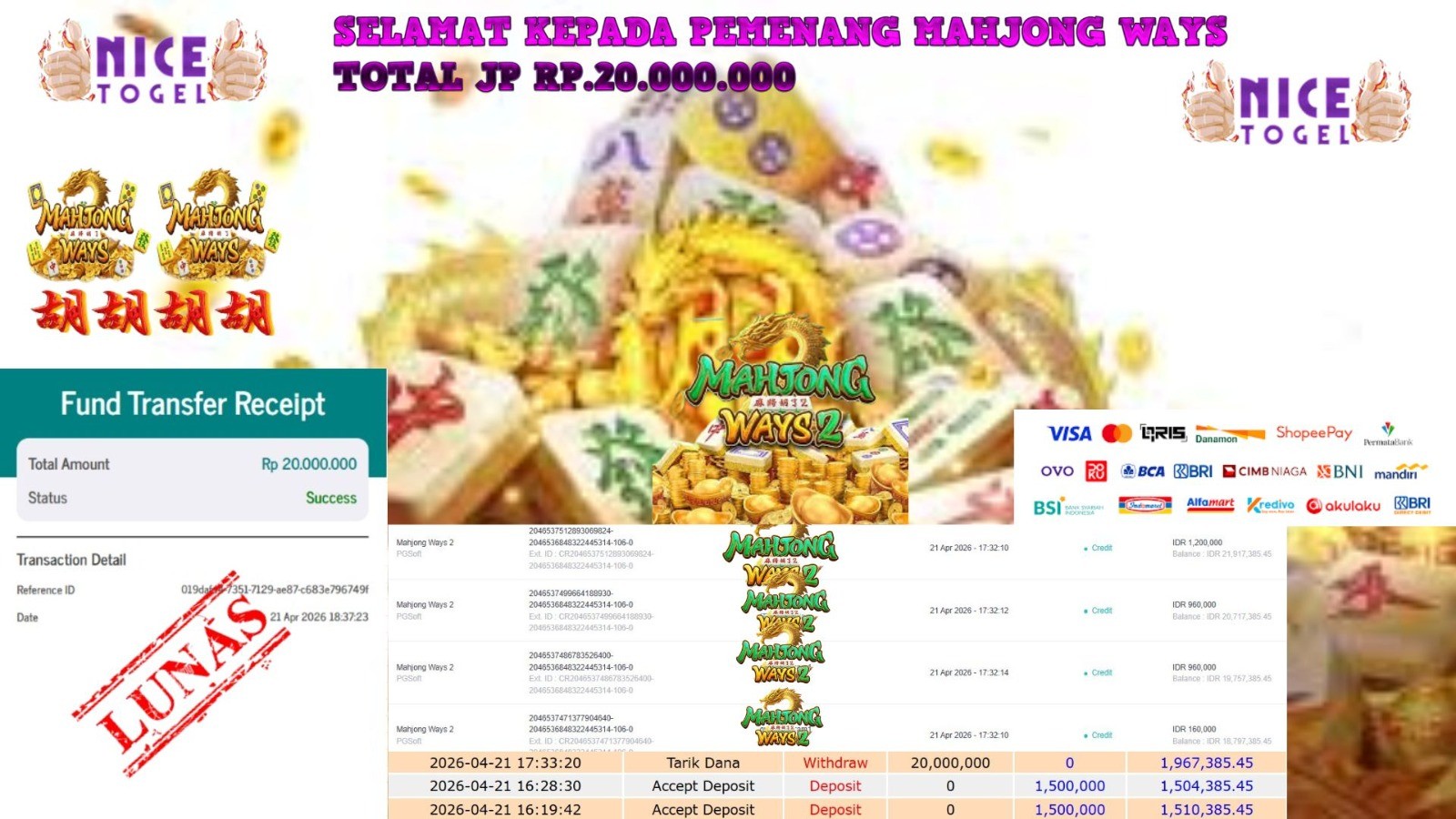 Selamat kepada User id : MJSF**** Telah berhasil mendapatkan kemenangan besar pada permainan SLOT MAHJONG WAYS 2 Dengan kemenangan Sebesar Rp. 20.000.000,- Setelah mengisi formulir withdraw dengan kurung waktu hanya 5 – 10 menit pihak NICETOGEL sudah melakukan transfer kepada pemilik Userid dan dana sudah dapat di cairkan oleh pemenang. Bukti pembayaran yang kami berikan merupakan bukti pembayaran yang SAH / VALID yang langung di dapatkan melaui tanda transfer transaksi dari Bank yang di tuju.
