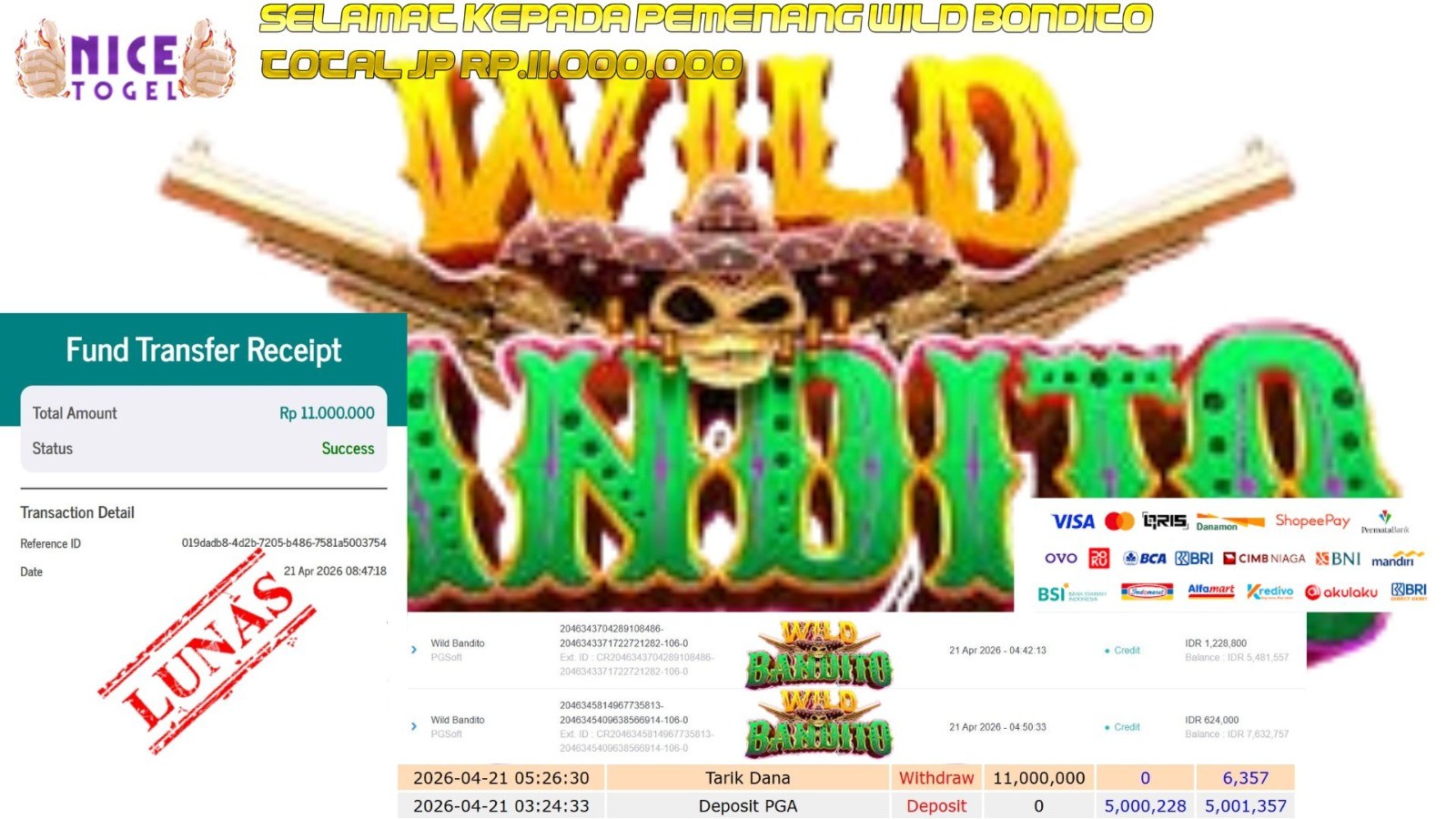 Selamat kepada User id : NFH**** Telah berhasil mendapatkan kemenangan besar pada permainan SLOT WILD BANDITO    Dengan kemenangan Sebesar Rp. 11.000.000,- Setelah mengisi formulir withdraw dengan kurung waktu hanya 5 – 10 menit pihak NICETOGEL sudah melakukan transfer kepada pemilik Userid dan dana sudah dapat di cairkan oleh pemenang. Bukti pembayaran yang kami berikan merupakan bukti pembayaran yang SAH / VALID yang langung di dapatkan melaui tanda transfer transaksi dari Bank yang di tuju.
