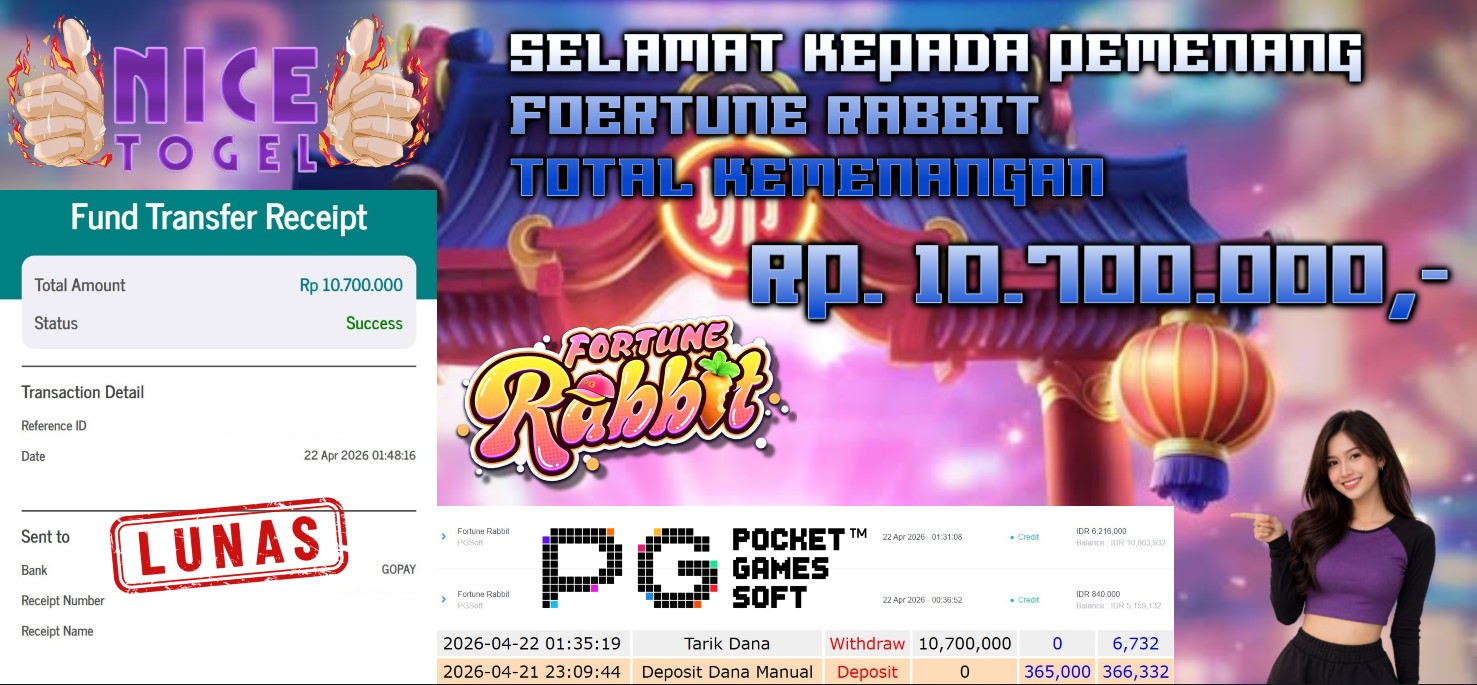 Selamat kepada User id : POF**** Telah berhasil mendapatkan kemenangan besar pada permainan SLOT FORTUNE RABBIT    Dengan kemenangan Sebesar Rp. 10.700.000,- Setelah mengisi formulir withdraw dengan kurung waktu hanya 5 – 10 menit pihak NICETOGEL sudah melakukan transfer kepada pemilik Userid dan dana sudah dapat di cairkan oleh pemenang. Bukti pembayaran yang kami berikan merupakan bukti pembayaran yang SAH / VALID yang langung di dapatkan melaui tanda transfer transaksi dari Bank yang di tuju.
