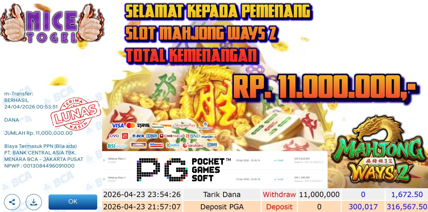 Selamat kepada User id : SAVR**** Telah berhasil mendapatkan kemenangan besar pada permainan SLOT MAHJONG WAYS 2 Dengan kemenangan Sebesar Rp. 11.000.000,- Setelah mengisi formulir withdraw dengan kurung waktu hanya 5 – 10 menit pihak NICETOGEL sudah melakukan transfer kepada pemilik Userid dan dana sudah dapat di cairkan oleh pemenang. Bukti pembayaran yang kami berikan merupakan bukti pembayaran yang SAH / VALID yang langung di dapatkan melaui tanda transfer transaksi dari Bank yang di tuju.