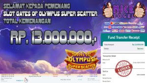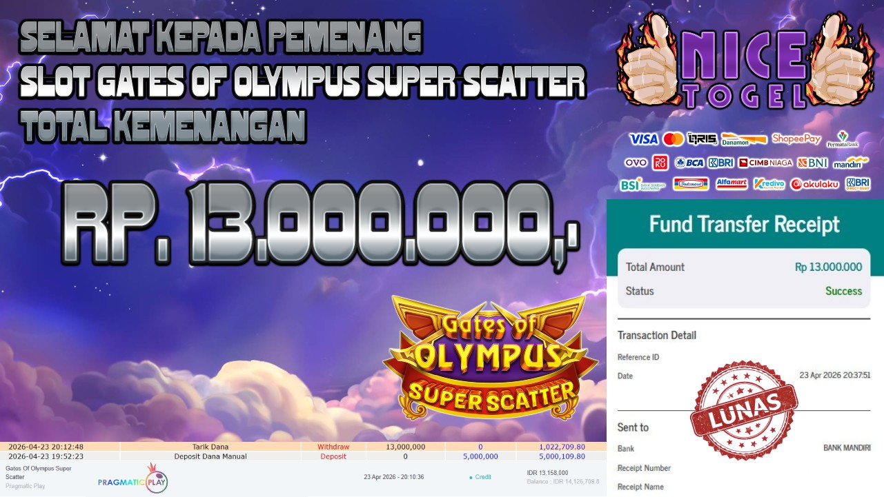 Selamat kepada User id : SABYU**** Telah berhasil mendapatkan kemenangan besar pada permainan SLOT GATES OF OLYMPUS SUPER SCATTER Dengan kemenangan Sebesar Rp. 13.000.000,- Setelah mengisi formulir withdraw dengan kurung waktu hanya 5 – 10 menit pihak NICETOGEL sudah melakukan transfer kepada pemilik Userid dan dana sudah dapat di cairkan oleh pemenang. Bukti pembayaran yang kami berikan merupakan bukti pembayaran yang SAH / VALID yang langung di dapatkan melaui tanda transfer transaksi dari Bank yang di tuju.