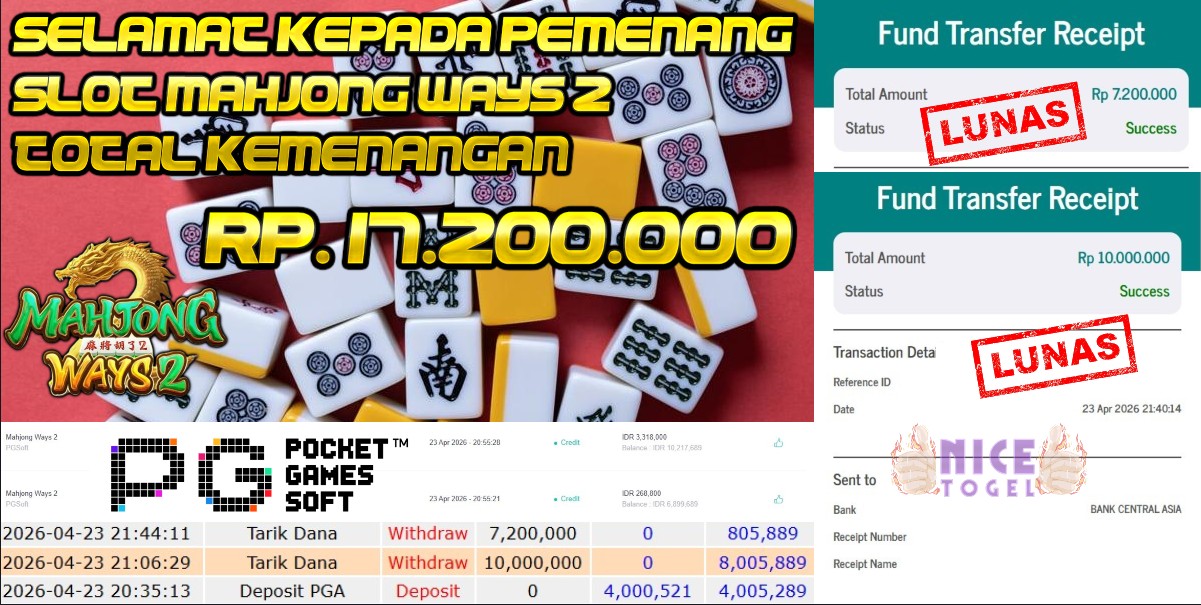 Selamat kepada User id : PRTY**** Telah berhasil mendapatkan kemenangan besar pada permainan SLOT MAHJONG WAYS 2 Dengan kemenangan Sebesar Rp. 17.200.000,- Setelah mengisi formulir withdraw dengan kurung waktu hanya 5 – 10 menit pihak NICETOGEL sudah melakukan transfer kepada pemilik Userid dan dana sudah dapat di cairkan oleh pemenang. Bukti pembayaran yang kami berikan merupakan bukti pembayaran yang SAH / VALID yang langung di dapatkan melaui tanda transfer transaksi dari Bank yang di tuju.