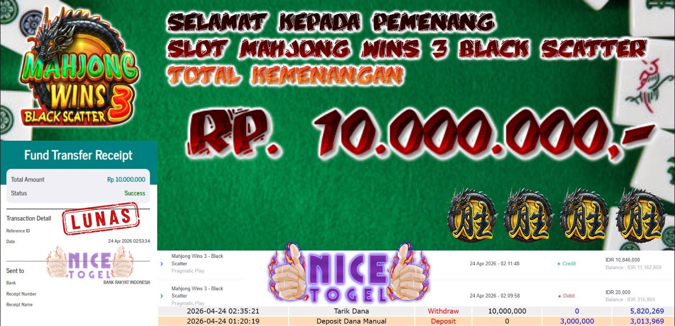 Selamat kepada User id : SANT**** Telah berhasil mendapatkan kemenangan besar pada permainan SLOT MAHJONG WINS 3 BLACK SCATTER Dengan kemenangan Sebesar Rp. 10.000.000,- Setelah mengisi formulir withdraw dengan kurung waktu hanya 5 – 10 menit pihak NICETOGEL sudah melakukan transfer kepada pemilik Userid dan dana sudah dapat di cairkan oleh pemenang. Bukti pembayaran yang kami berikan merupakan bukti pembayaran yang SAH / VALID yang langung di dapatkan melaui tanda transfer transaksi dari Bank yang di tuju.