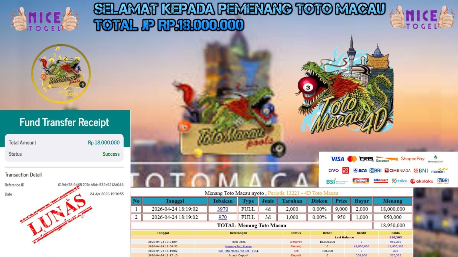 Selamat kepada User id : NFG**** Telah berhasil mendapatkan kemenangan besar pada permainan TOGEL TOTOMACAU Dengan kemenangan Sebesar Rp. 18.000.000,- Setelah mengisi formulir withdraw dengan kurung waktu hanya 5 – 10 menit pihak NICETOGEL sudah melakukan transfer kepada pemilik Userid dan dana sudah dapat di cairkan oleh pemenang. Bukti pembayaran yang kami berikan merupakan bukti pembayaran yang SAH / VALID yang langung di dapatkan melaui tanda transfer transaksi dari Bank yang di tuju.