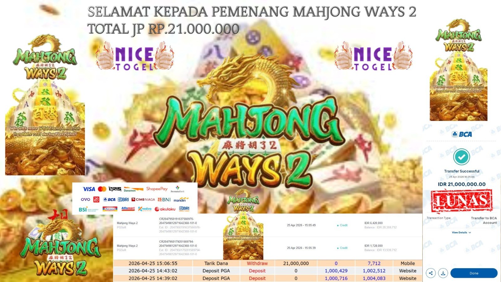 Selamat kepada User id : MFG**** Telah berhasil mendapatkan kemenangan besar pada permainan SLOT MAHJONG WAYS 2   Dengan kemenangan Sebesar Rp. 21.000.000,- Setelah mengisi formulir withdraw dengan kurung waktu hanya 5 – 10 menit pihak NICETOGEL sudah melakukan transfer kepada pemilik Userid dan dana sudah dapat di cairkan oleh pemenang. Bukti pembayaran yang kami berikan merupakan bukti pembayaran yang SAH / VALID yang langung di dapatkan melaui tanda transfer transaksi dari Bank yang di tuju.