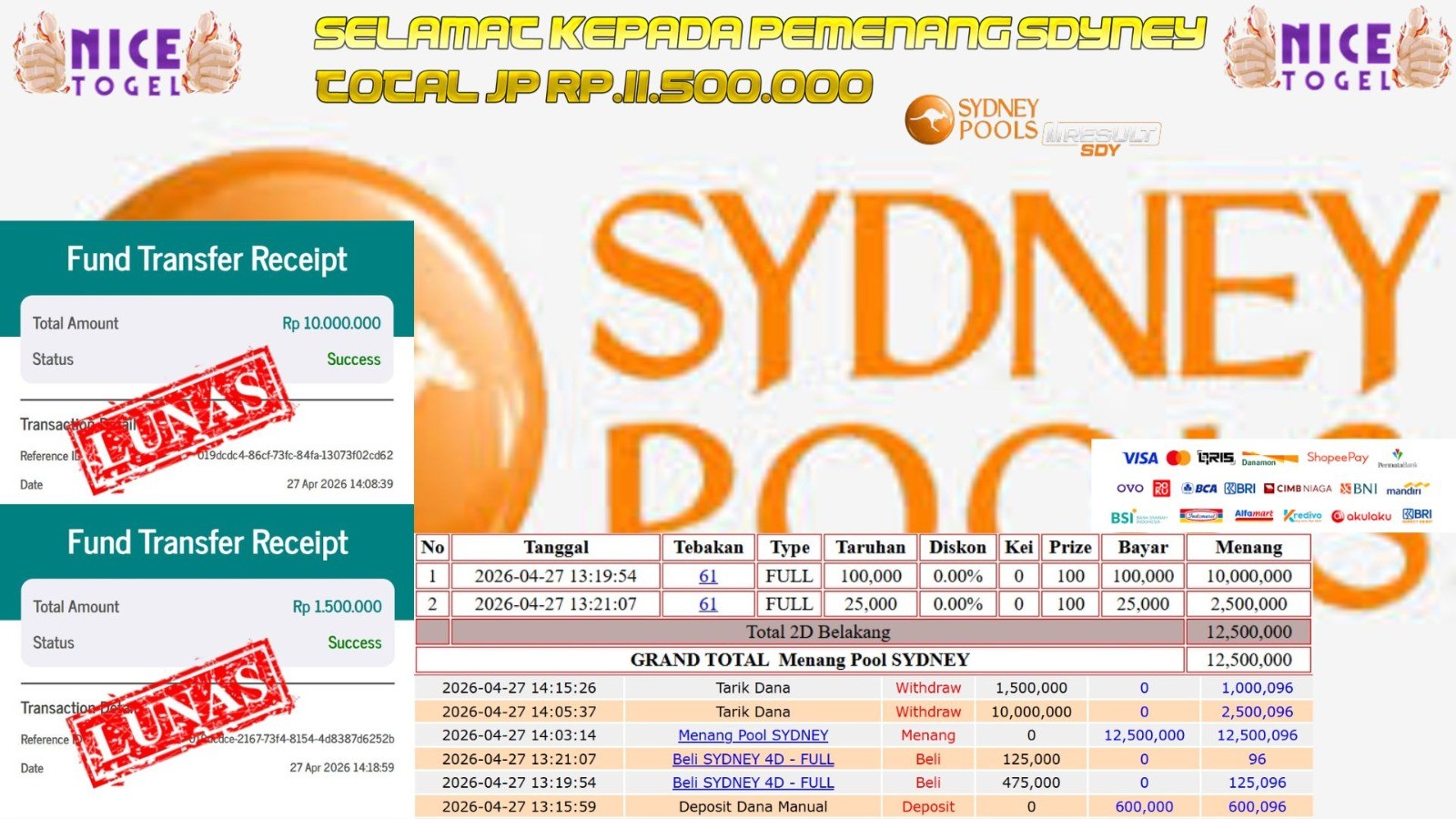 Selamat kepada User id : RARA**** Telah berhasil mendapatkan kemenangan besar pada permainan TOGEL SYDNEY Dengan kemenangan Sebesar Rp. 11.500.000,- Setelah mengisi formulir withdraw dengan kurung waktu hanya 5 – 10 menit pihak NICETOGEL sudah melakukan transfer kepada pemilik Userid dan dana sudah dapat di cairkan oleh pemenang. Bukti pembayaran yang kami berikan merupakan bukti pembayaran yang SAH / VALID yang langung di dapatkan melaui tanda transfer transaksi dari Bank yang di tuju.