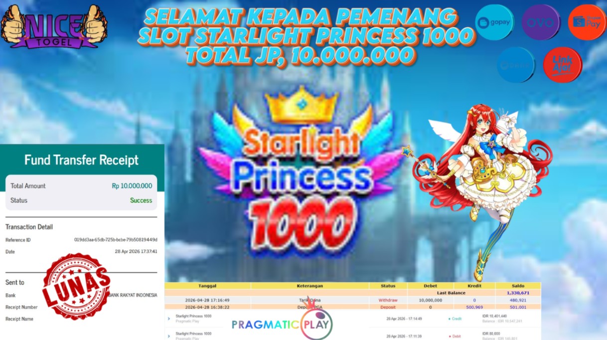 Selamat kepada User id : BDHD**** Telah berhasil mendapatkan kemenangan besar pada permainan SLOT STARLIGHT PRINCESS 1000 Dengan kemenangan Sebesar Rp. 10.000.000,- Setelah mengisi formulir withdraw dengan kurung waktu hanya 5 – 10 menit pihak NICETOGEL sudah melakukan transfer kepada pemilik Userid dan dana sudah dapat di cairkan oleh pemenang. Bukti pembayaran yang kami berikan merupakan bukti pembayaran yang SAH / VALID yang langung di dapatkan melaui tanda transfer transaksi dari Bank yang di tuju.