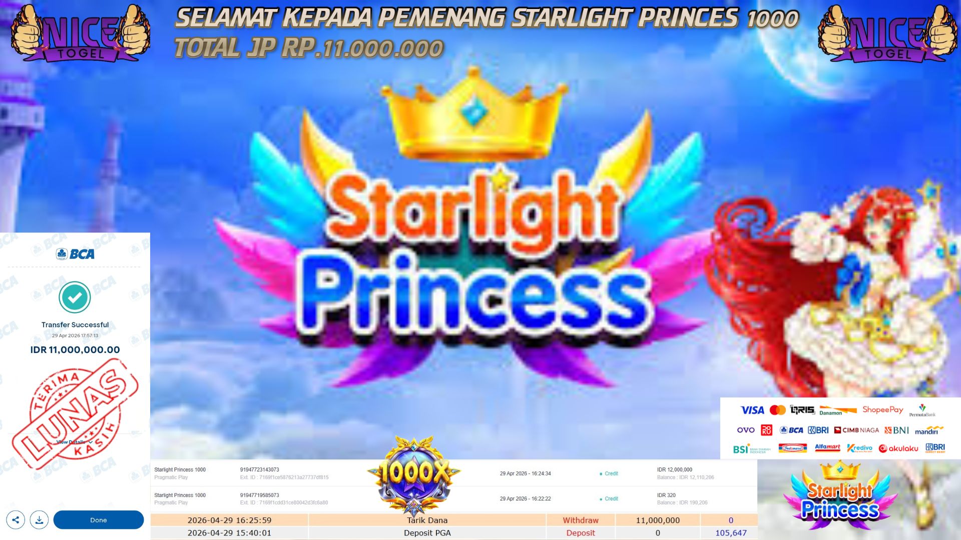 Selamat kepada User id : WAYD**** Telah berhasil mendapatkan kemenangan besar pada permainan SLOT STARLIGHT PRINCESS 1000 Dengan kemenangan Sebesar Rp. 11.000.000,- Setelah mengisi formulir withdraw dengan kurung waktu hanya 5 – 10 menit pihak NICETOGEL sudah melakukan transfer kepada pemilik Userid dan dana sudah dapat di cairkan oleh pemenang. Bukti pembayaran yang kami berikan merupakan bukti pembayaran yang SAH / VALID yang langung di dapatkan melaui tanda transfer transaksi dari Bank yang di tuju.