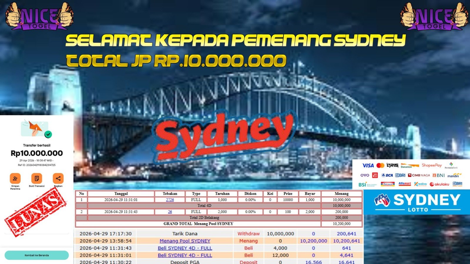 Selamat kepada User id : BFG**** Telah berhasil mendapatkan kemenangan besar pada permainan TOGEL SYDNEY Dengan kemenangan Sebesar Rp. 10.000.000,- Setelah mengisi formulir withdraw dengan kurung waktu hanya 5 – 10 menit pihak NICETOGEL sudah melakukan transfer kepada pemilik Userid dan dana sudah dapat di cairkan oleh pemenang. Bukti pembayaran yang kami berikan merupakan bukti pembayaran yang SAH / VALID yang langung di dapatkan melaui tanda transfer transaksi dari Bank yang di tuju.