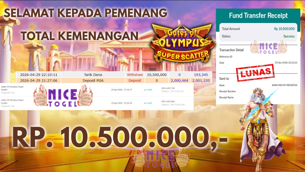 Selamat kepada User id : JGYF**** Telah berhasil mendapatkan kemenangan besar pada permainan SLOT GATES OF OLYMPUS SUPER SCATTER Dengan kemenangan Sebesar Rp. 10.500.000,- Setelah mengisi formulir withdraw dengan kurung waktu hanya 5 – 10 menit pihak NICETOGEL sudah melakukan transfer kepada pemilik Userid dan dana sudah dapat di cairkan oleh pemenang. Bukti pembayaran yang kami berikan merupakan bukti pembayaran yang SAH / VALID yang langung di dapatkan melaui tanda transfer transaksi dari Bank yang di tuju.