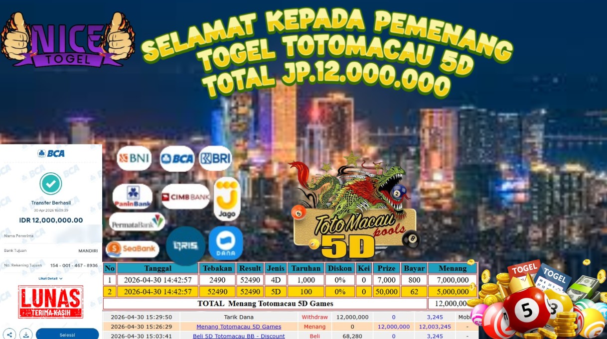 Selamat kepada User id : DFGH**** Telah berhasil mendapatkan kemenangan besar pada permainan TOGEL TOTOMACAU 5D Dengan kemenangan Sebesar Rp. 12.000.000,- Setelah mengisi formulir withdraw dengan kurung waktu hanya 5 – 10 menit pihak NICETOGEL sudah melakukan transfer kepada pemilik Userid dan dana sudah dapat di cairkan oleh pemenang. Bukti pembayaran yang kami berikan merupakan bukti pembayaran yang SAH / VALID yang langung di dapatkan melaui tanda transfer transaksi dari Bank yang di tuju.