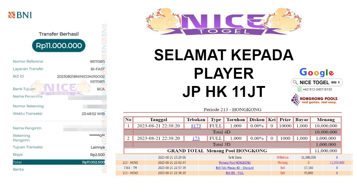 Selamat kepada User id : Kol** Telah berhasil mendapatkan kemenangan besar pada permainan TOGEL HONGKONG Dengan kemenangan Sebesar Rp.11.000.000,- Setelah mengisi formulir withdraw dengan kurung waktu hanya 5 – 10 menit pihak NICETOGEL sudah melakukan transfer kepada pemilik Userid dan dana sudah dapat di cairkan oleh pemenang. Bukti pembayaran yang kami berikan merupakan bukti pembayaran yang SAH / VALID yang langung di dapatkan melaui tanda transfer transaksi dari Bank yang di tuju.